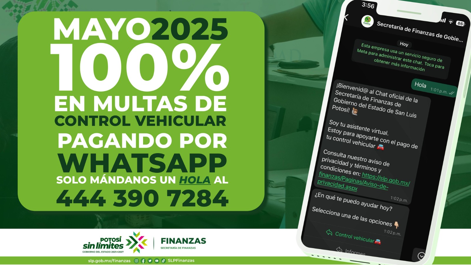 El Gobierno del Estado de San Luis Potosí, a través de la Secretaría de Finanzas (Sefin), implementa durante el mes de mayo un programa de descuento total en el pago de multas de control vehicular, exclusivamente al realizar el trámite a través de WhatsApp.
