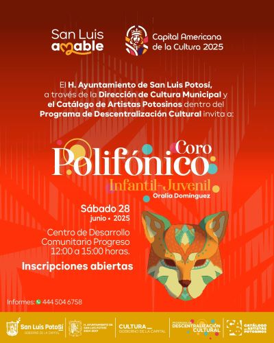 Para mayores informes comunicarse con el responsable del programa de descentralización, maestro Jorge Cabrera, con número de WhatsApp al 444 5046758, o bien a redes sociales de Cultura Municipal.