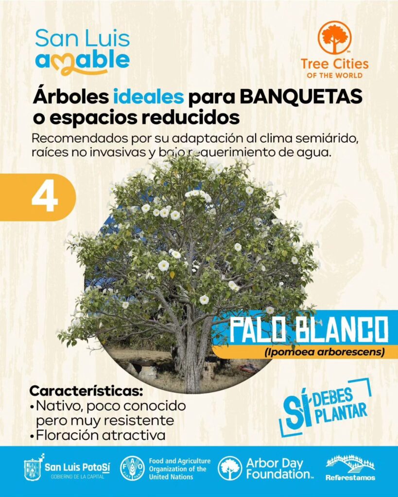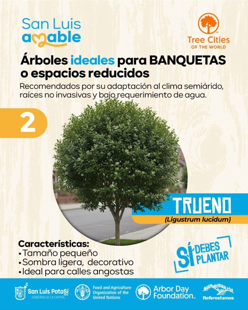 Con el objetivo de fomentar un entorno urbano más sustentable y armónico, la Dirección de Servicios Municipales del Ayuntamiento de San Luis Potosí difundió una lista de árboles recomendados para plantar en banquetas y espacios reducidos, ideales por su resistencia al clima semiárido, raíces no invasivas y bajo requerimiento hídrico.