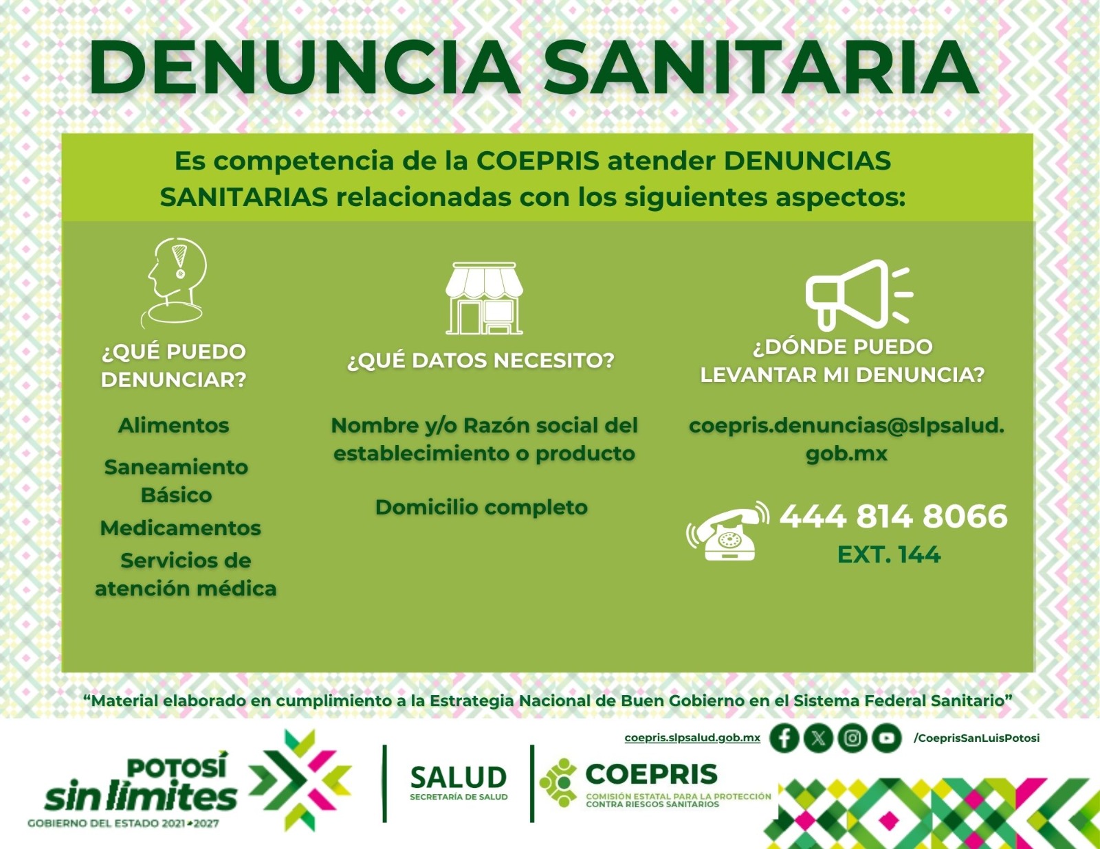 A través de la Denuncia Sanitaria se busca atender hechos, actos u omisiones en materia sanitaria que de acuerdo a la perspectiva del denunciante, provoque un riesgo o daño a la salud de la población; la queja puede enviarse al correo electrónico coepris.denuncias@slpsalud.gob.mx al teléfono 444 833 78 57 extensión 114 o bien, directamente en la ventanilla de los siete Centros Integrales de Servicios ubicados para el interior del estado en las instalaciones de las Jurisdicciones Sanitarias y para la capital potosina, el Centro Integral se encuentra en las instalaciones de la COEPRIS ubicadas en la calle 05 de mayo No. 1485, Barrio de San Miguelito.