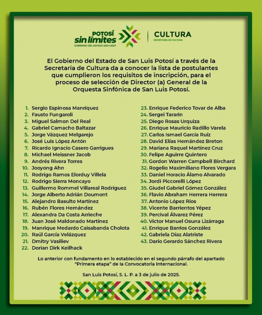 En seguimiento a la Convocatoria Internacional para el proceso de selección de la persona que ocupará la Dirección General de la Orquesta Sinfónica de San Luis Potosí, el Gobierno del Estado encabezado por Ricardo Gallardo Cardona, a través de la Secretaría de Cultura (Secult), informa que este 3 de julio de 2025 se publicó en sus redes oficiales la lista de aspirantes que cumplieron con los requisitos establecidos en la convocatoria conforme al párrafo segundo del apartado denominado Primera Etapa.