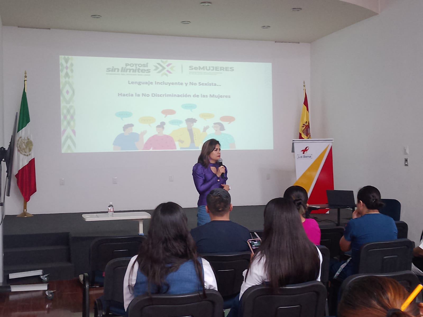 La Secretaría de las Mujeres e Igualdad Sustantiva (Semujeres) brindó capacitación a 70 trabajadoras y trabajadores de la delegación federal de la Secretaría de Infraestructura, Comunicaciones y Transportes (SICT) y 30 integrantes de la Bene San Luis enfocada en conceptos de género e igualdad.
