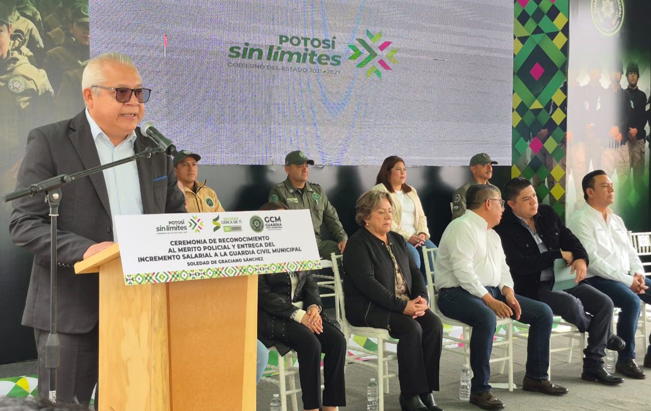 Soledad de Graciano Sánchez transita por la ruta correcta en materia de seguridad pública siendo un referente a nivel estatal por sumarse a la iniciativa de crear la Guardia Civil Municipal, hoy cuenta con elementos profesionales, comprometidos y la convicción de servir profesionalmente a la sociedad, sostuvo el titular de la Secretaría de Seguridad y Protección Ciudadana del Estado, Jesús Juárez Hernández, al acudir a la ceremonia de entrega de reconocimientos y estímulos al personal policial.
