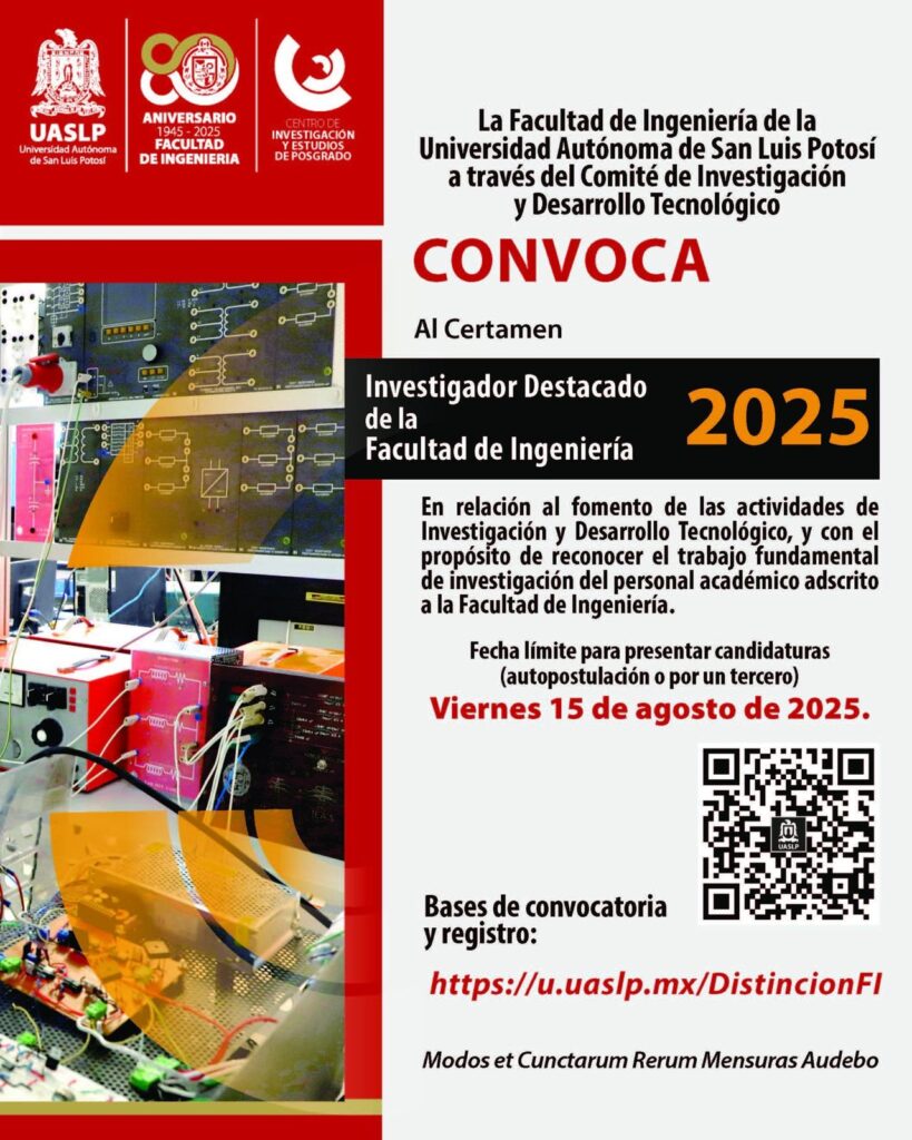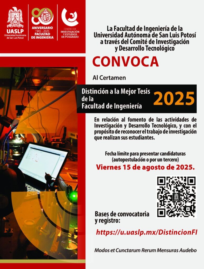 La Facultad de Ingeniería de la Universidad Autónoma de San Luis Potosí (UASLP) lanzó la convocatoria 2025 del certamen “Distinción a la Mejor Tesis” e “Investigador Destacado”, que busca reconocer los trabajos más destacados en los niveles de licenciatura, maestría y doctorado, así como la trayectoria de investigadoras e investigadores de la institución.