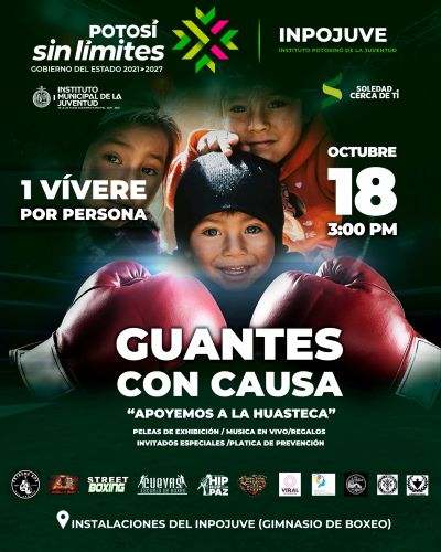 El Instituto Potosino de la Juventud (Inpojuve), en coordinación con direcciones de la Juventud de Soledad de Graciano Sánchez y Villa de Pozos, así como el colectivo Bendito Estilo, Red Viral y la Clínica de Rehabilitación Luchando Sobrios, organiza el evento “Guantes con Causa: Apoyemos a la Huasteca”, con el propósito de recaudar víveres y artículos de primera necesidad para las familias afectadas por las recientes lluvias en la región Huasteca.