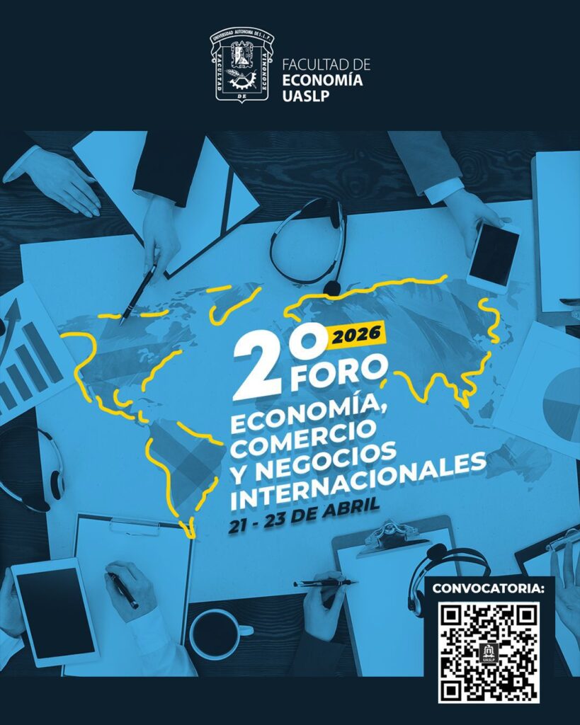 La Facultad de Economía de la Universidad Autónoma de San Luis Potosí (UASLP) llevará a cabo del 22 al 24 de abril de 2026 el “2º Foro Nacional de Economía, Comercio y Negocios Internacionales”, que se realizará en el Centro de Emprendimiento e Innovación Universitario. El anuncio fue realizado por la directora de la entidad, doctora María Isabel Graciela Vélez Dávila, acompañada por los doctores Oliver René Arroyo Leos y Juan Carlos Yánez Luna, docentes de la Facultad.