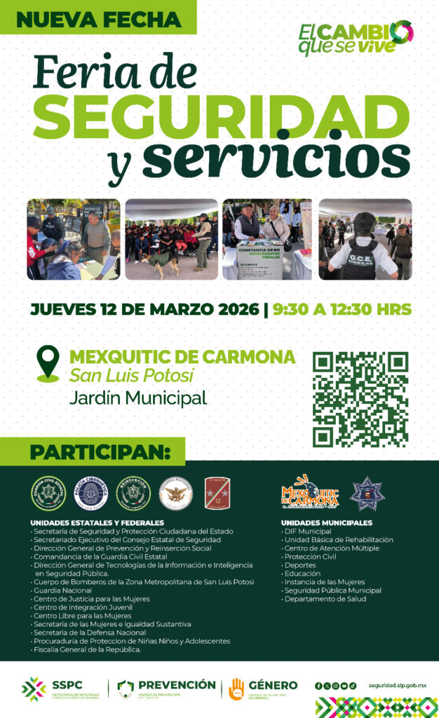 La Secretaría de Seguridad y Protección Ciudadana del Estado (SSPC) impulsa una estrategia de prevención y proximidad social mediante acciones en los 59 municipios, como las Ferias de Seguridad y Servicios de Salinas de Hidalgo y Soledad de Graciano Sánchez donde se brindó atención directa a más de 4 mil 200 personas.