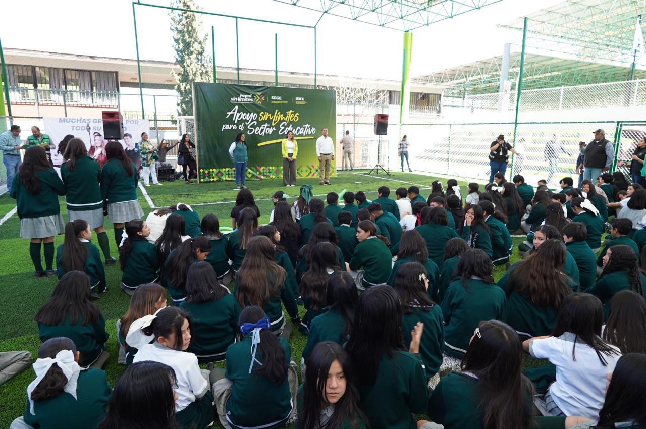Por su parte, en la secundaria, alrededor de 800 alumnas y alumnos cuentan ahora con espacios renovados gracias a la rehabilitación del plantel y la construcción de una cancha de pasto sintético que fomenta la actividad física y la vida saludable.