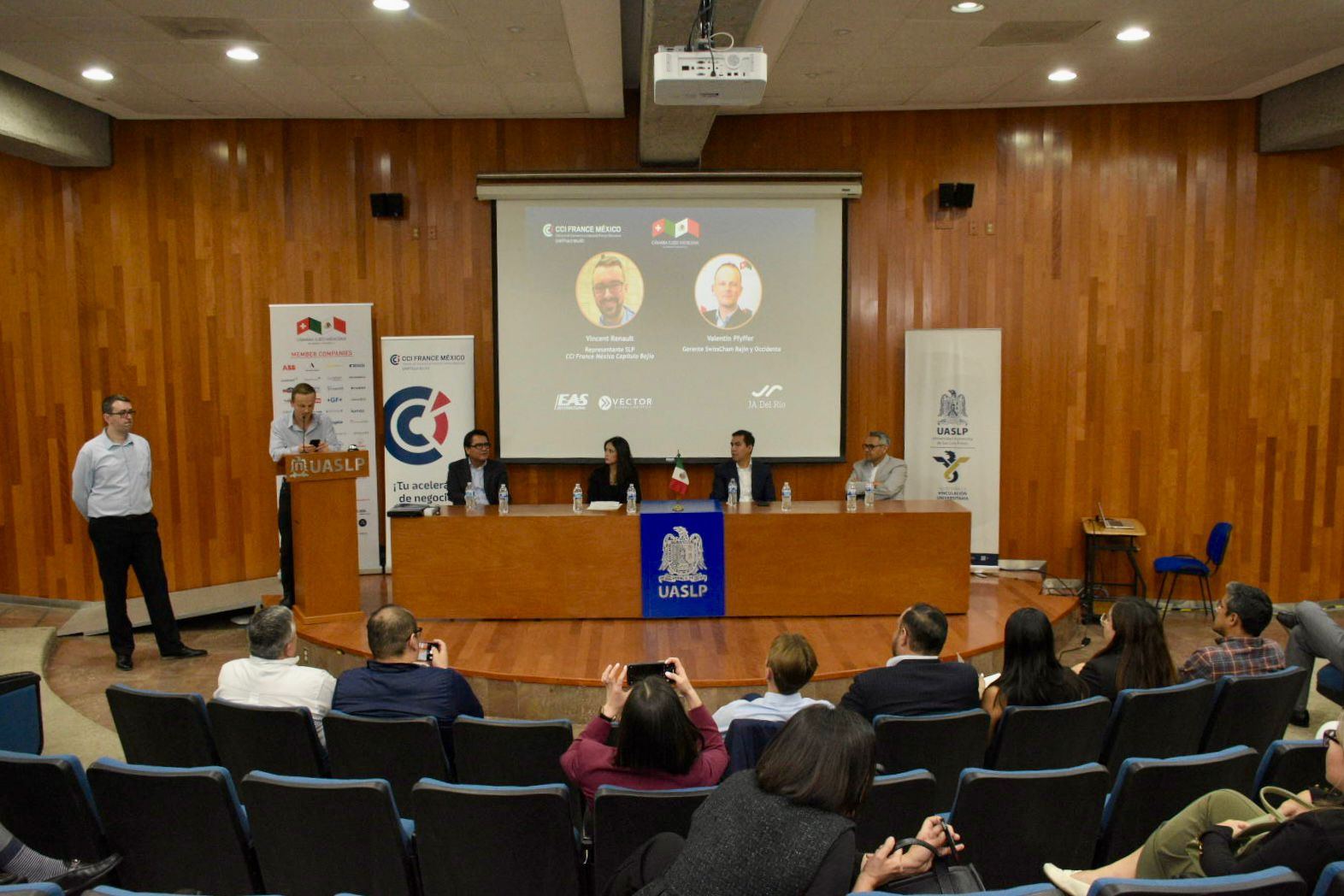 Este 19 de marzo se llevó a cabo el afterwork temático Comercio Exterior: Retos y oportunidades en tiempos de cambio en el Centro de Emprendimiento e Innovación de la Universidad Autónoma de San Luis Potosí, con la participación de empresarios, funcionarios estatales y docentes universitarios. El encuentro fue organizado por la Cámara de Comercio e Industria Franco Mexicana capítulo Bajío, en colaboración con SwissCham México, con el objetivo de abrir un espacio de diálogo sobre el entorno económico internacional.