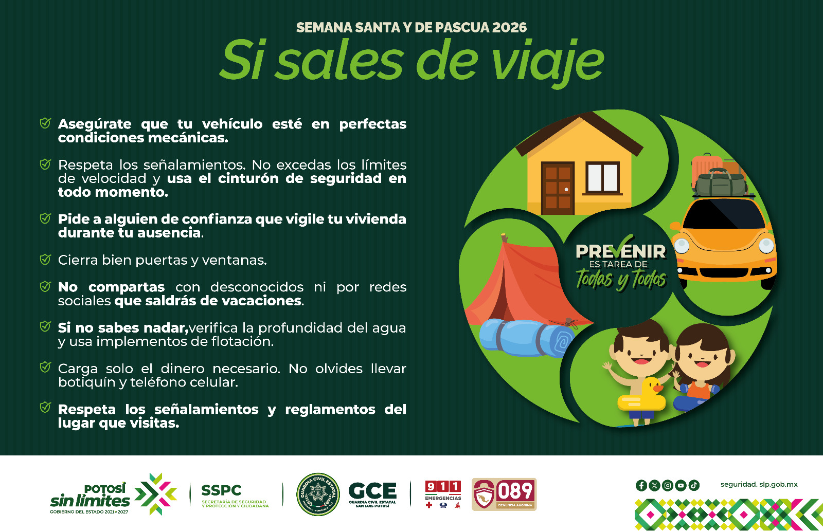 Entre las recomendaciones destacan asegurar puertas y ventanas al salir de casa, evitar dejar llaves en exteriores y pedir apoyo a familiares o vecinos para vigilar la vivienda. Asimismo, se exhorta a no compartir en redes sociales información sobre ausencias, revisar las condiciones mecánicas del vehículo antes de viajar, respetar los límites de velocidad y hacer uso responsable de las líneas 911 y 089. En parajes y balnearios, es fundamental supervisar a niñas y niños, atender las indicaciones de seguridad y prevenir riesgos