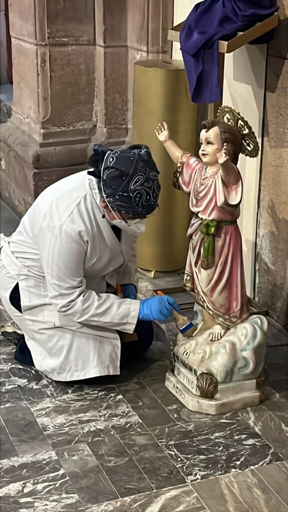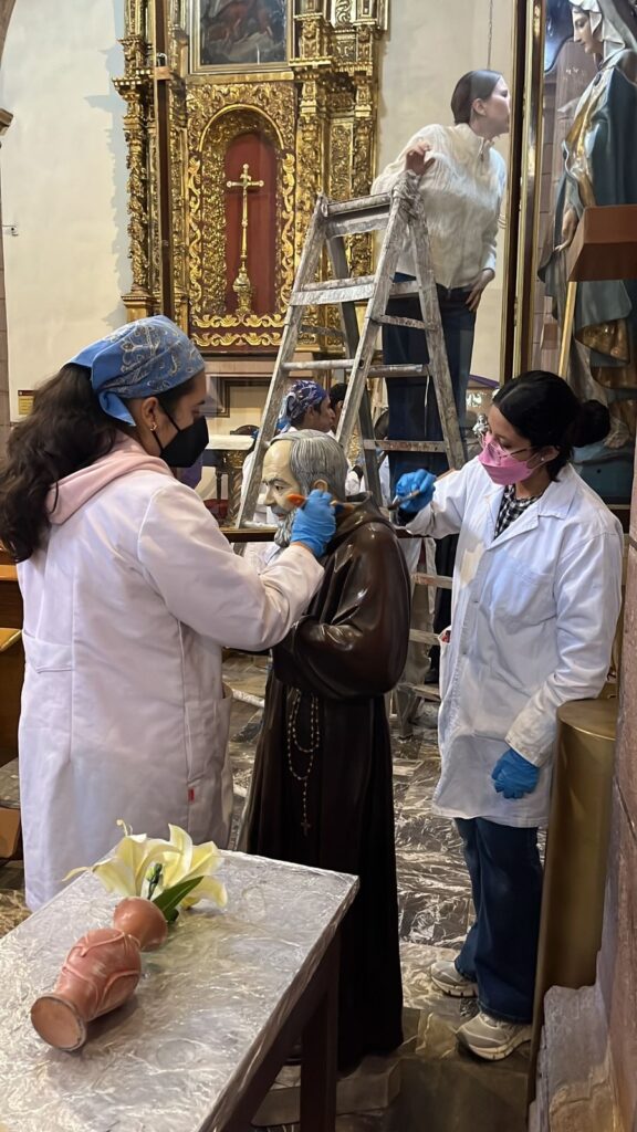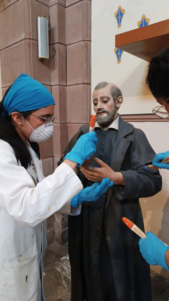 Como parte del convenio de colaboración vigente entre el Instituto Nacional de Antropología e Historia (INAH) y la Universidad Autónoma de San Luis Potosí (UASLP), y en un gesto que combina compromiso social, vocación profesional y sentido humano, estudiantes de la Licenciatura en Conservación y Restauración de Bienes Culturales Muebles participaron de manera voluntaria en la limpieza superficial de imágenes religiosas de la Capilla de Loreto, afectadas tras el incendio registrado en la puerta principal del Templo de la Compañía durante la manifestación del pasado 8 de marzo.