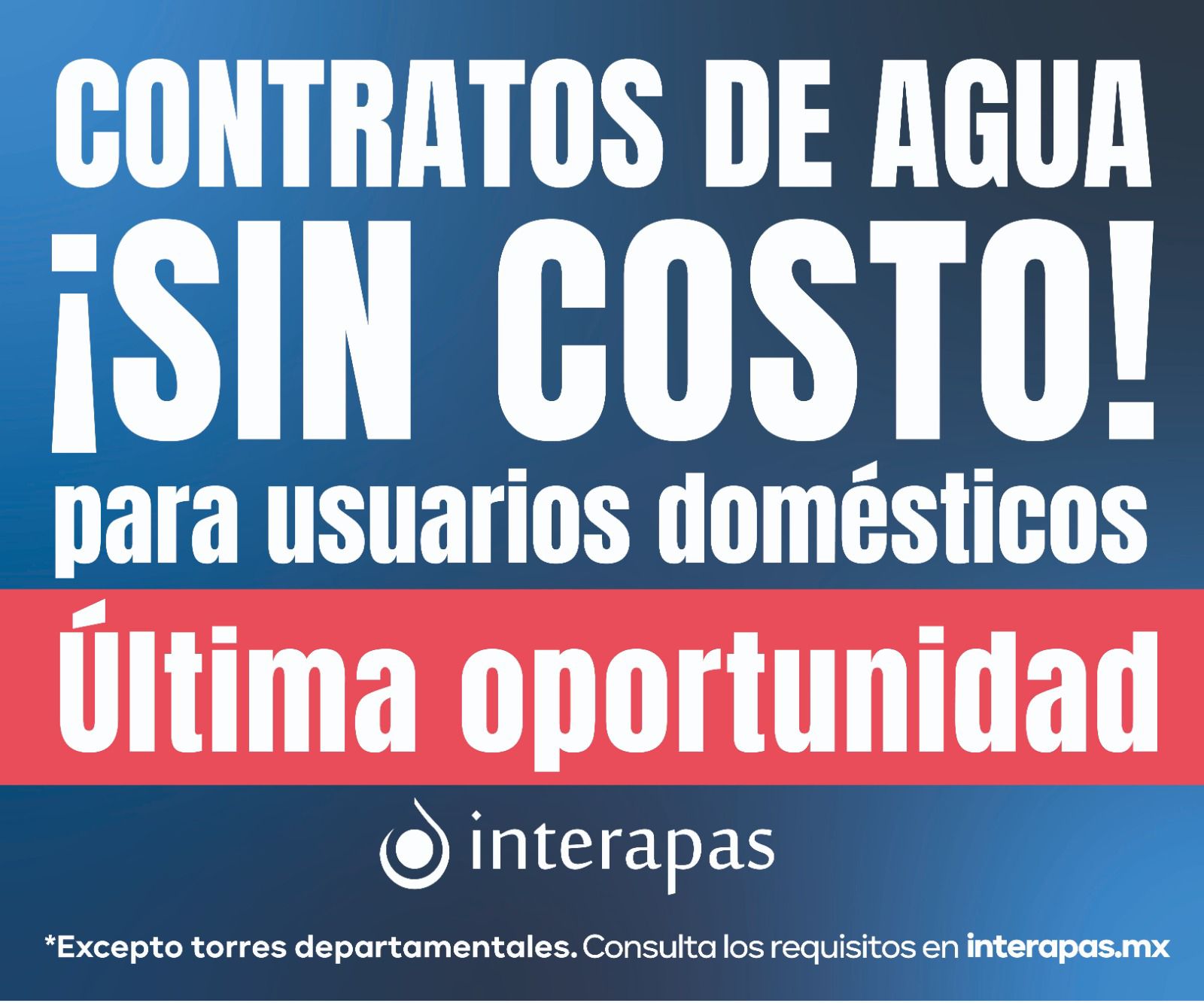 Interapas invita a las y los usuarios a no dejar pasar esta oportunidad, ya que es la última etapa del programa para regularizar el servicio de agua sin costo de contratación.