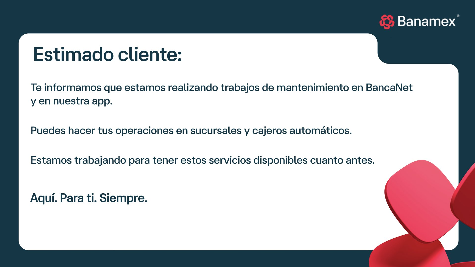 En su cuenta en la red social X, Banamex publicó un mensaje en el que informa que está realizando mantenimiento a la banca electrónica y su aplicación.