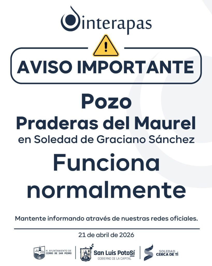 Interapas informa que el pozo Praderas del Maurel, en el municipio de Soledad de Graciano Sánchez, opera con normalidad y actualmente se encuentra en funcionamiento.