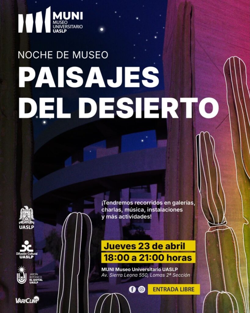 “Paisajes del Desierto” será la temática de la noche de museo que el MUNI Museo Universitario de la UASLP presentará este jueves 23 de abril. La invitación está abierta al público en general para participar en una jornada que incluirá recorridos por galerías, charlas, música e instalaciones, en un horario de 18:00 a 21:00 horas, con entrada libre, informó en entrevista el licenciado Octavio Alonso López, coordinador del recinto.